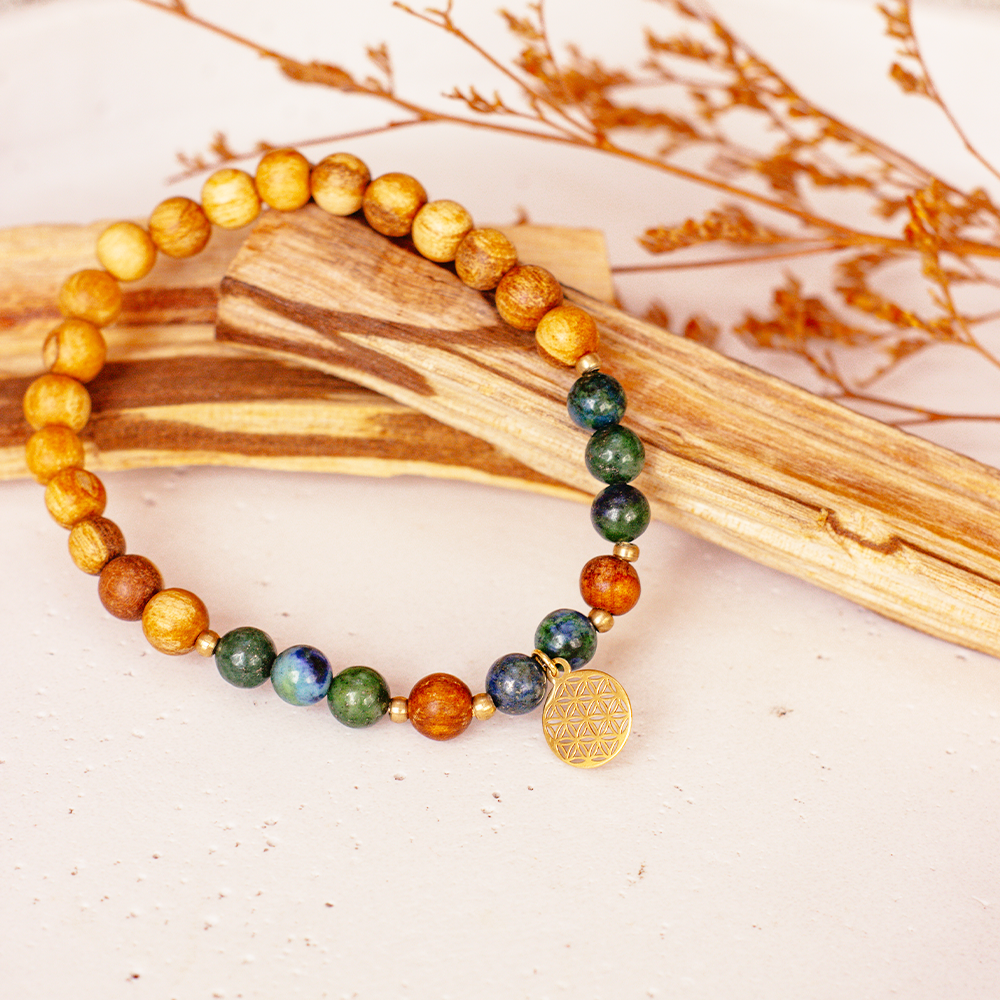 Dieses wunderschöne Palo Santo Armband aus zertifiziertem Palo Santo Holz und schimmerndem Azurit-Malachit wird von mir mit viel Liebe, Sorgfalt und einem feinen Gespür für Details von Hand gefertigt. Jedes einzelne Armband ist ein kleines Unikat, bei dem die Materialien achtsam ausgewählt und harmonisch kombiniert werden, um eine besondere Ausstrahlung und Energie zu schaffen.