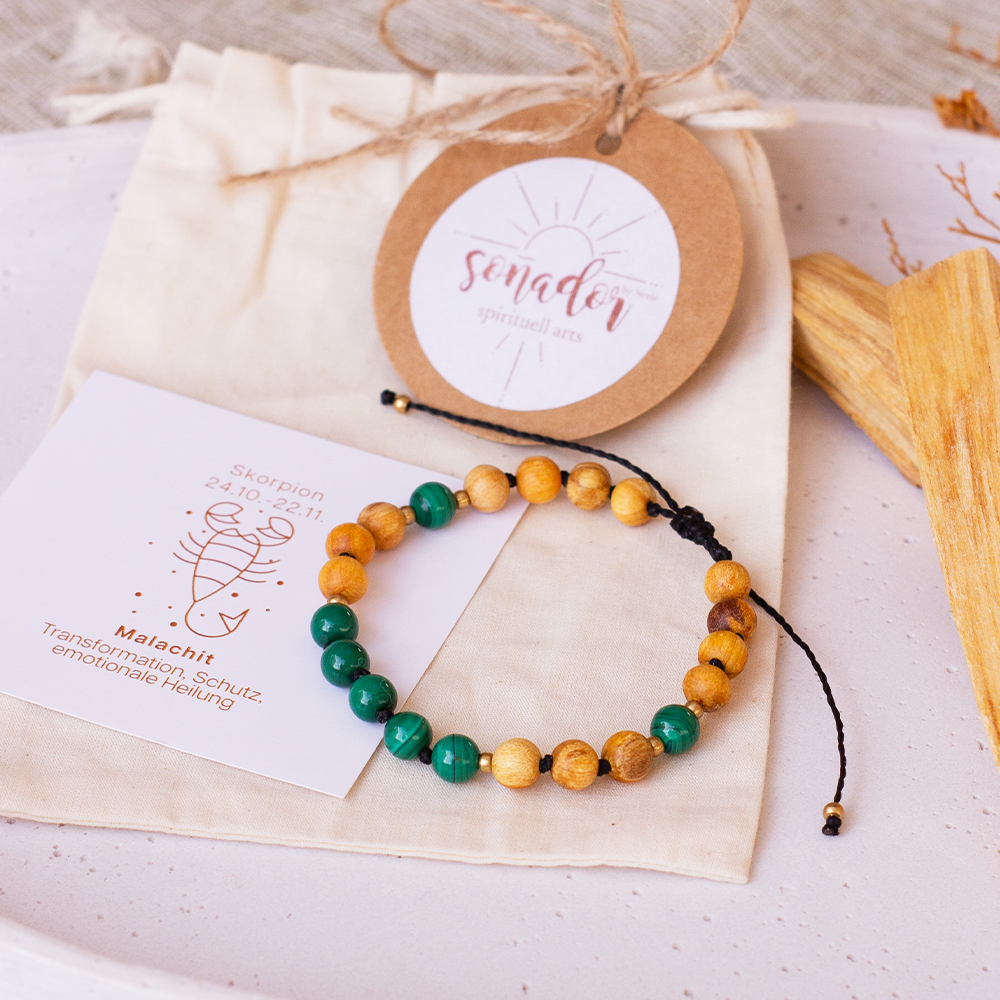 Dieses wunderschöne Palo Santo Sternzeichenarmband aus zertifiziertem Palo Santo Holz und schimmerndem Malachit wird von mir mit viel Liebe, Sorgfalt und einem feinen Gespür für Details von Hand gefertigt. Jedes einzelne Armband ist ein kleines Unikat, bei dem die Materialien achtsam ausgewählt und harmonisch kombiniert werden, um eine besondere Ausstrahlung und Energie zu schaffen.